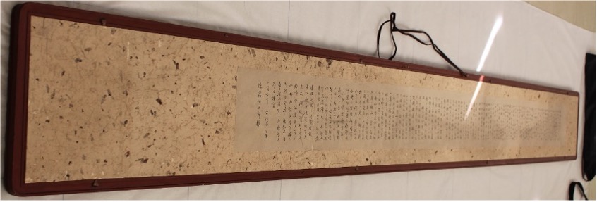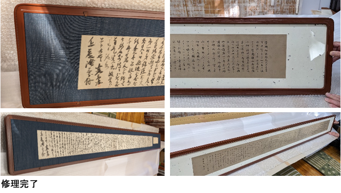 骨寸法が273×2840mmの額で、既存の縁を修復し塗り直しを行い、書状は灰汁抜きし、