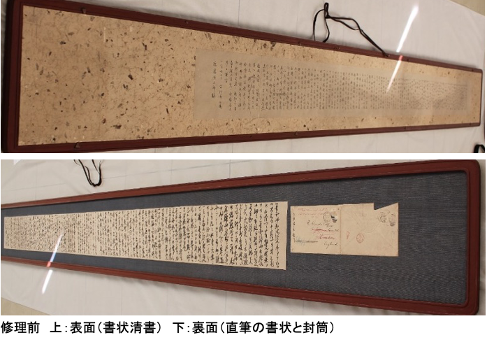 裏打ちをやり直しました。また両面とも新しく布張り、和紙張り した上に書状を張り込み